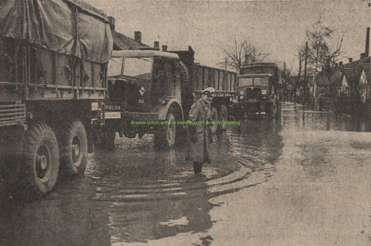 In response to the crisis, the city of Hamelin requested assistance from the local garrison, and, as on many occasions before, the British troops once again came to the aid of the population. Ritchie Smith, who was on duty at the time as a medical orderly with an ambulance truck on standby, later recognised in a Dewezet newspaper photograph the AEC lorries belonging to the 2nd Troop of the 23rd Amphibious Engineer Squadron.